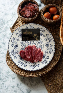 El Salchichón Ibérico Herradura destaca por su sabor suave y aromático, fruto de la combinación de carnes ibéricas de calidad y especias naturales. Con una curación lenta y cuidada, ofrece una textura jugosa y un gusto refinado, ideal para quienes buscan un embutido delicado pero lleno de matices.