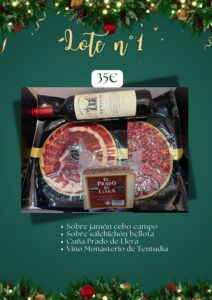 Productos incluidos: Sobre jamón cebo campo Sobre salchichón bellota Cuña Prado de Llera Vino Monasterio de Tentudía