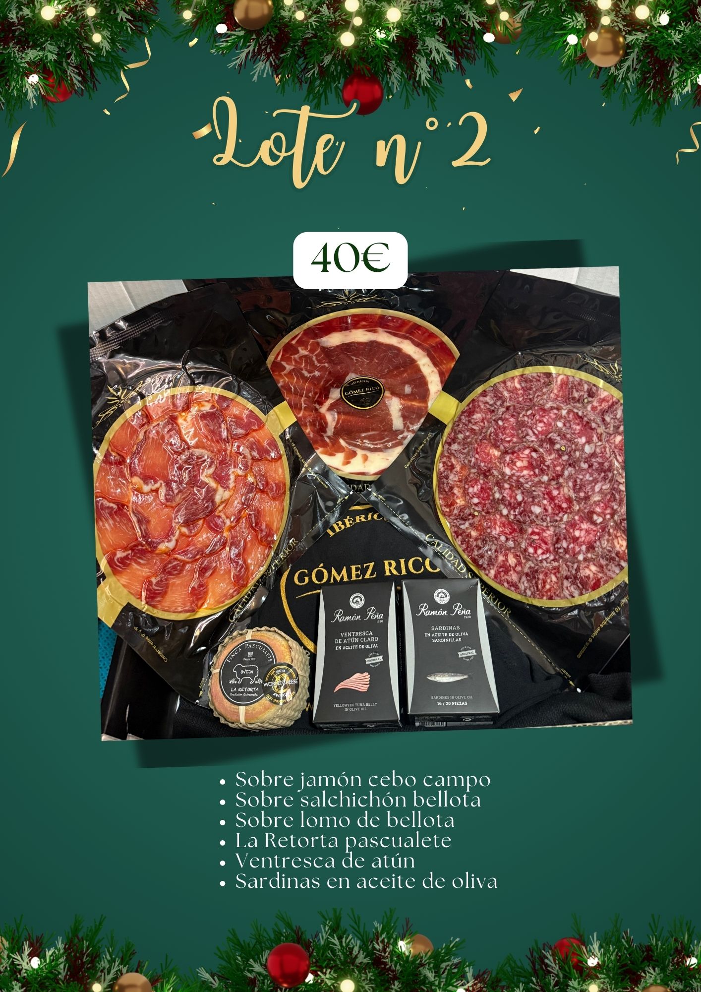 Productos que incluye: Sobre jamón cebo campo Sobre salchichón bellota Sobre lomo de bellota La Retorta pascualete Ventresca de atún Sardinas en aceite de oliva